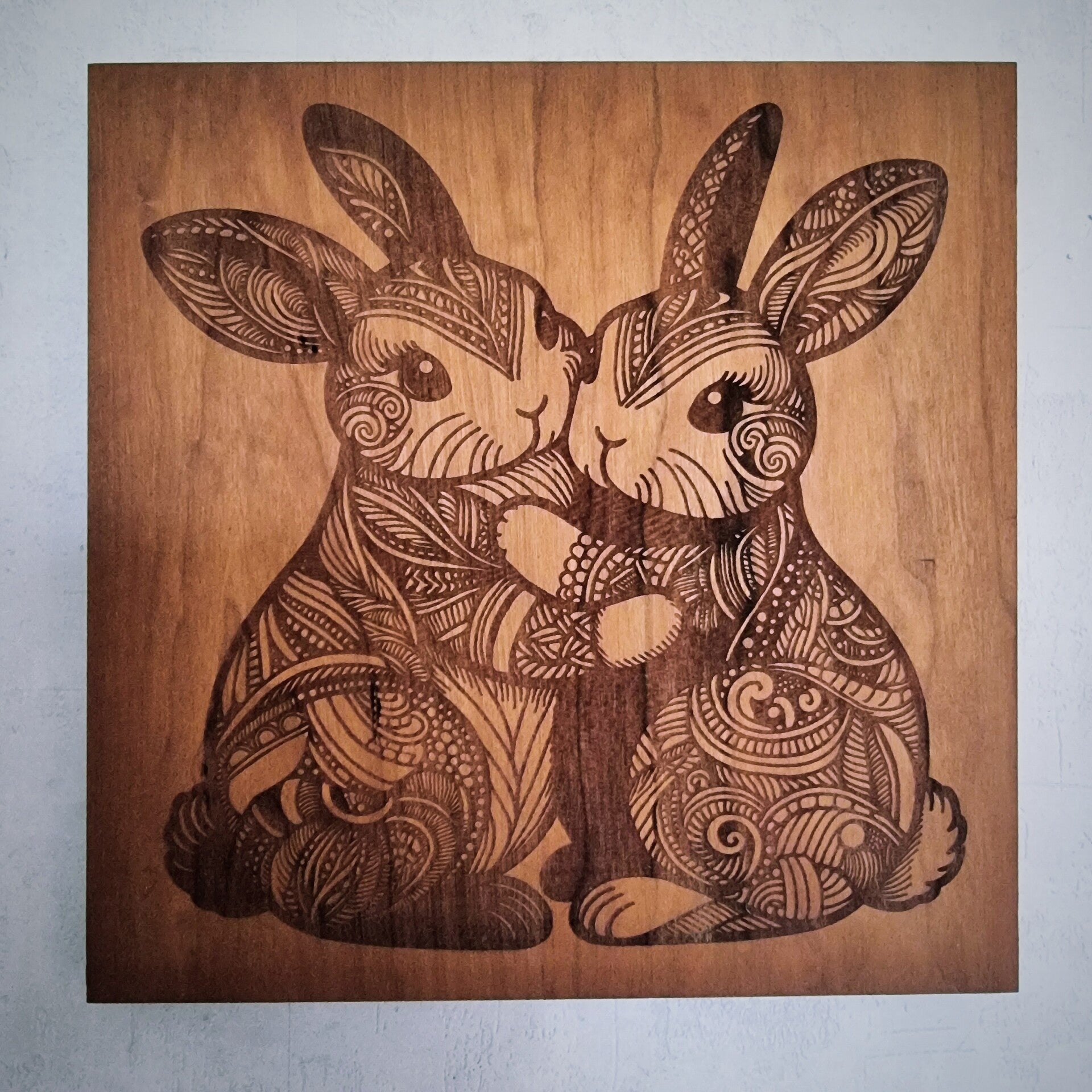 Betoverende paasvreugde: een knuffelende konijntjesgravure op kersenhout Laat deze paasdagen gevuld zijn met warmte en liefde, zoals deze twee schattige konijntjes die voor altijd zijn vereeuwigd op prachtig kersenhout.