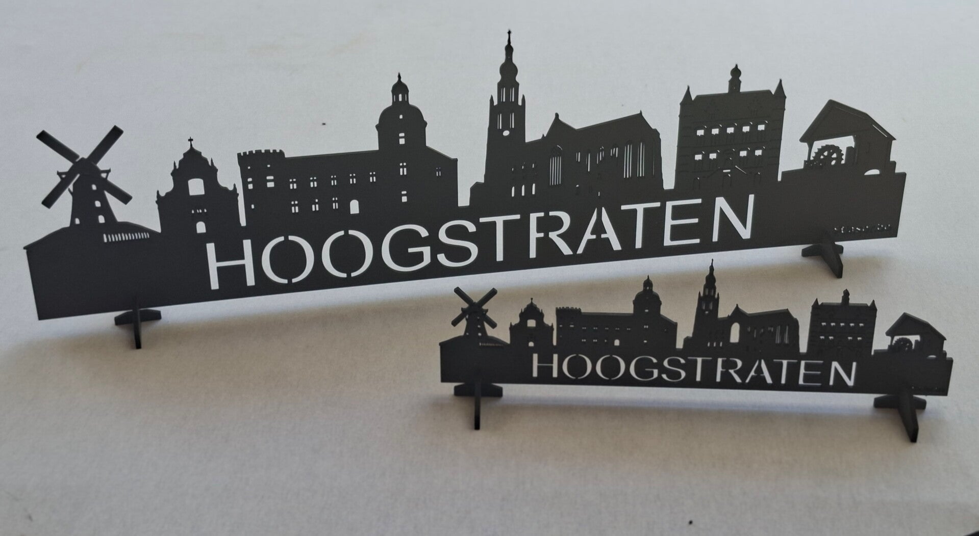 Breng een stukje Hoogstraten in huis met deze uniekeskyline! Onze skyline is zorgvuldig uitgesnedenen toont de mooiste en meest herkenbare gebouwen van Hoogstraten, waaronder de Salm Salm Molen - Begijnhof - Gelmelslot - kerk - stadhuis - Laermolen