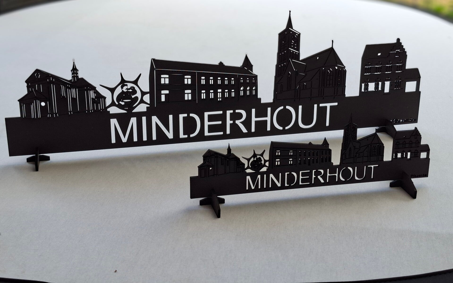 Breng een stukje Minderhout in huis met deze unieke skyline! Onze skyline is zorgvuldig uitgesneden en toont de mooiste en meest herkenbare gebouwen van Minderhout, waaronder de Kapel Onze-Lieve-Vrouw van den Akker - papboer - klooster - kerk - pastorij