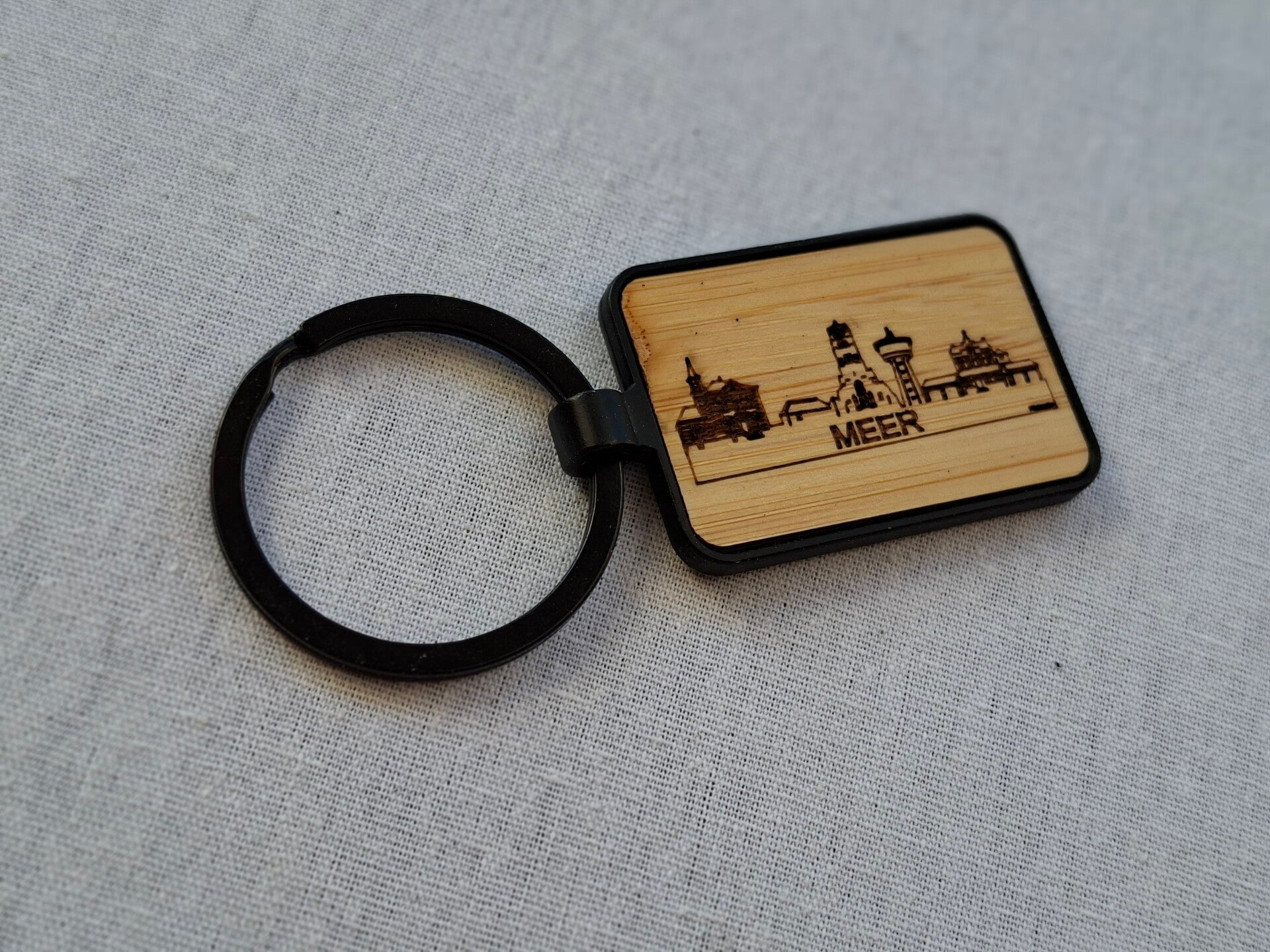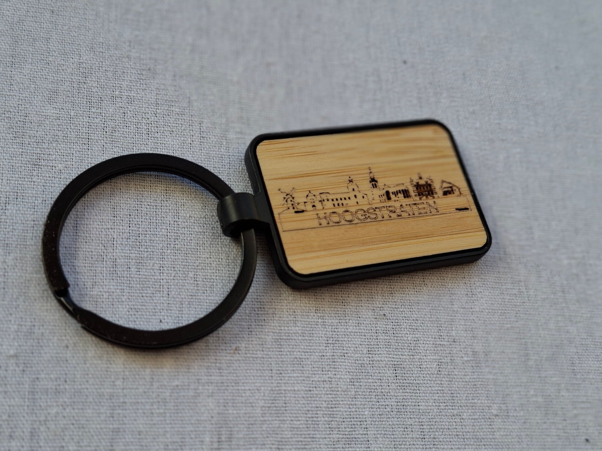 Deze sleutelhanger met een metalen frame met daarin bamboe word gegraveerd met onze populaire skylines.